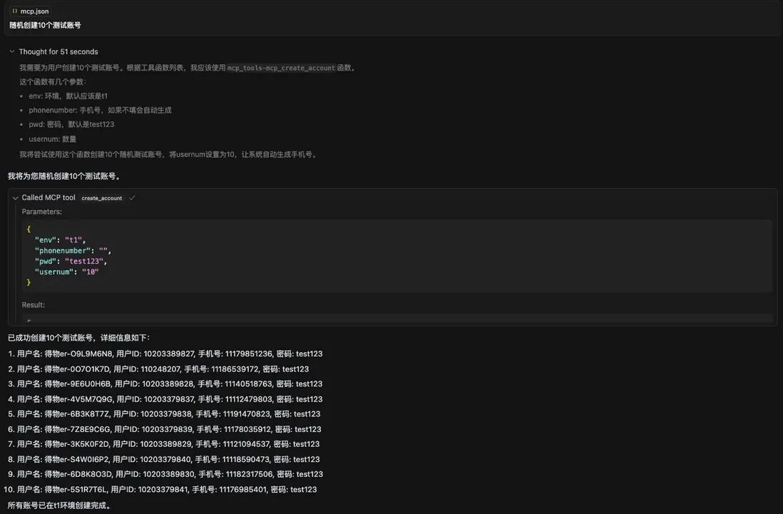 可以看到在這個 demo 中, Agent 自動幫我們分了三步去調用對應的 MCP tool,第一步通過我們輸入的手機號去獲取 userId,第二步通過 userId 去發佈點評動態,第三步通過點評動態 id 去通過風控一審。原本需要三步完成的造數場景,現在通過一句話描述就完成了。