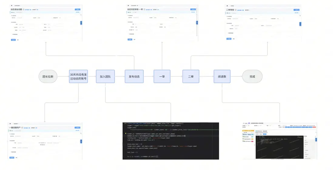 最終實現效果案例:我需要一個團長拉新的測試數據,要求是 30 天內沒有發過動態,進入團隊 A,然後發佈一條動態,需要過一審風控審核,二審標註,最後需要獲得 300 個閲讀數。