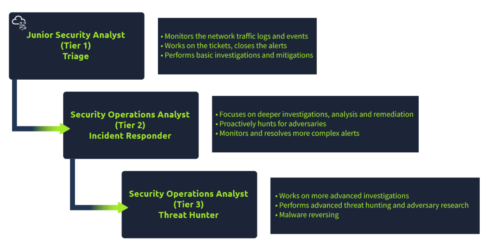 隨着您作為初級安全分析師的進步和技能的提高,您最終將晉升至第 2 級和第 3 級。