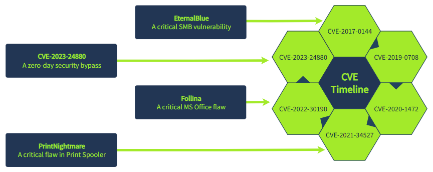 一旦漏洞被公開,就會被分配一個通用漏洞披露 ( CVE ) 編號。從那時起,一場爭分奪秒的競賽就開始了:攻擊者開發漏洞利用程序,而防禦者則爭分奪秒地更新系統。以下是 Windows 漏洞每年演變的詳細時間線: