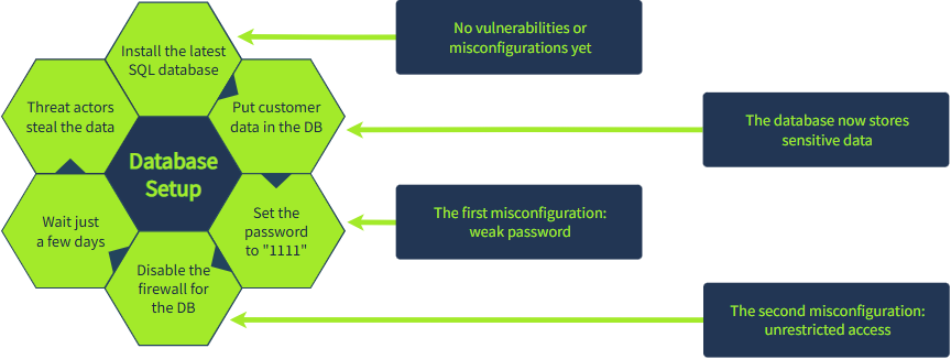 另一種常見情況是,IT 部門在不知情的情況下,在安全系統中引入了新的漏洞。以下是一個簡單的示例,説明由於不安全的配置,關鍵數據庫是如何被攻破的: