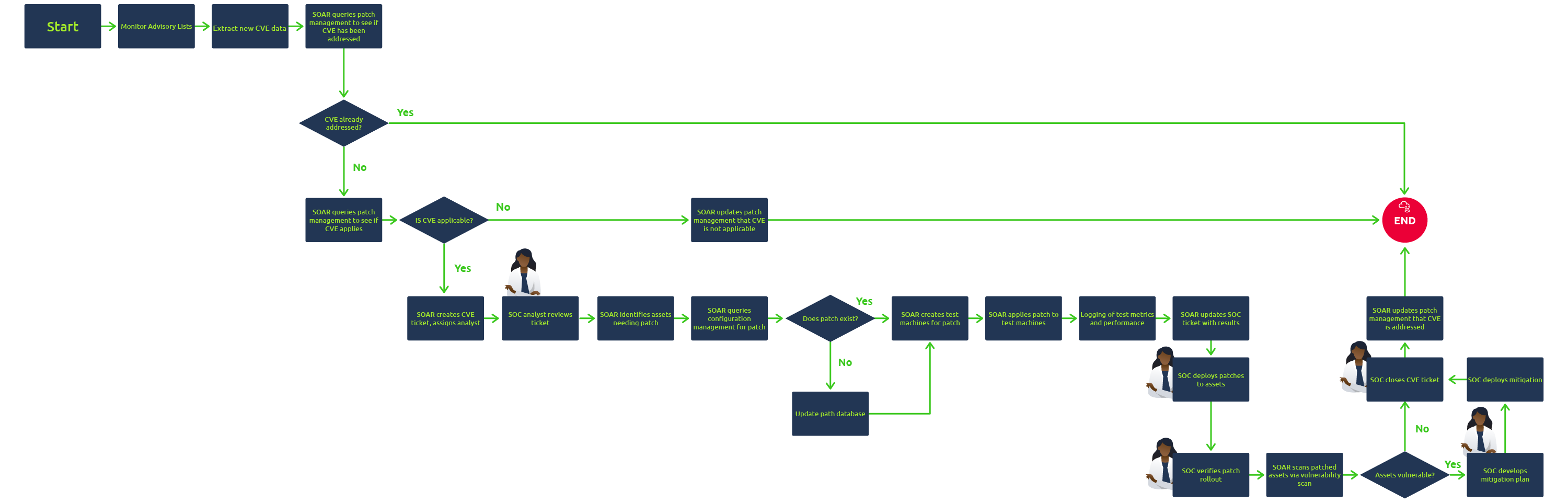 CVE (通用漏洞披露)是指已公開披露並分配有CVE編號的漏洞。作為漏洞管理的一部分,SOC團隊必須處理新發布的 CVE,驗證其是否存在於網絡中,如果存在則進行修補。分析師必須時刻關注有關新 CVE 及其修復計劃的發佈信息。這個過程可能會變得非常繁瑣,導致積壓的 CVE 數量不斷增加,補丁程序無法及時應用,從而使環境更加脆弱。此外,由於 CVE 發佈頻繁,這個過程會佔用SOC團隊大量的時間和資源。因此,為了解決這個問題,我們可以像處理網絡釣魚案例一樣,在SOAR工具中創建一個處理 CVE 的劇本。