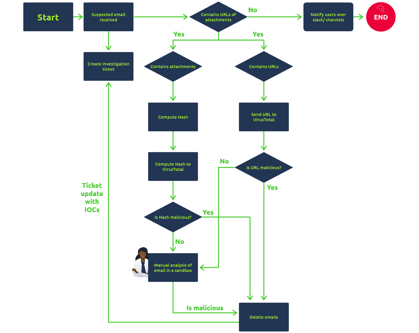 假設您是一位經驗豐富的安全運營中心 (SOC)分析師,專門處理網絡釣魚警報。您正在培訓一位初級分析師如何應對網絡釣魚警報。為此,您繪製了一張流程圖,供他們在調查此類警報時參考。為了更好地幫助您的初級分析師,您會在流程圖中添加哪些內容?從收到“收到可疑電子郵件”的警報開始,您可能會告訴他們接下來應該採取哪些步驟。他們應該創建一個工單,並檢查電子郵件是否包含 URL 或附件。如果沒有,只需通知用户;如果有,下一步該怎麼做?後續步驟將取決於郵件是否包含 URL 或附件。因此,流程圖中會包含大量的“如果發生這種情況,則執行此操作;否則,執行此操作”的指令。這就是釣魚應對手冊的製作方式。下圖展示了一個釣魚應對手冊,説明了在每個步驟中應該做什麼。