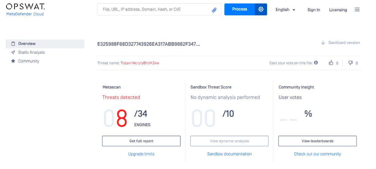 可以使用各種在線工具進行哈希查找,例如VirusTotal和Metadefender Cloud - OPSWAT。
