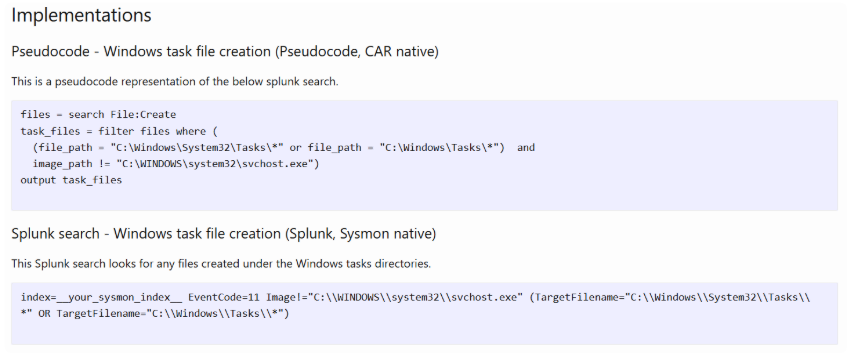 在 “實現” 部分,我們提供了偽代碼、Splunk查詢和 LogPoint 搜索示例,展示了分析師如何使用其組織的安全信息和事件管理 ( SIEM ) 平台來篩選此技術。偽代碼是一種簡潔易懂的方式,用於描述程序或系統將執行的一組指令或算法。請注意,並非 CAR 中的每個分析都具有相同的實現示例。某些分析甚至包含單元測試,分析師可以使用這些測試來驗證分析是否按預期運行。