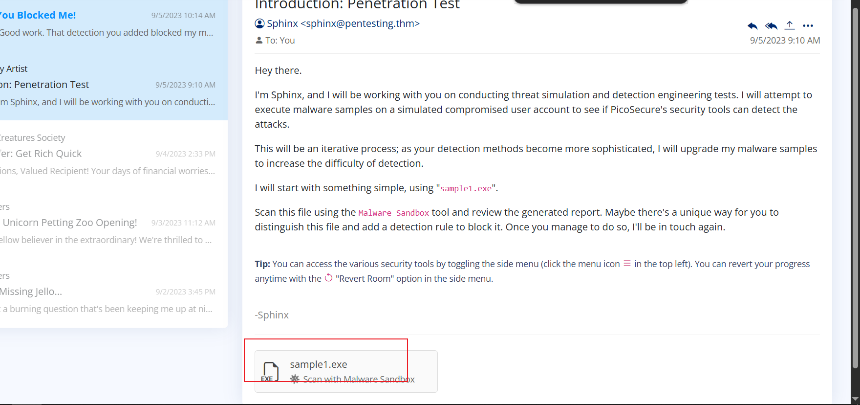 在經歷了太多次安全事件響應活動後,PicoSecure 決定開展威脅模擬和檢測工程演練,以增強其惡意軟件檢測能力。您已被指派與外部滲透測試人員合作,參與一個迭代式的紫隊演練場景。測試人員將嘗試在模擬的內部用户工作站上運行惡意軟件樣本。與此同時,您需要配置 PicoSecure 的安全工具,以檢測並阻止惡意軟件的運行。
