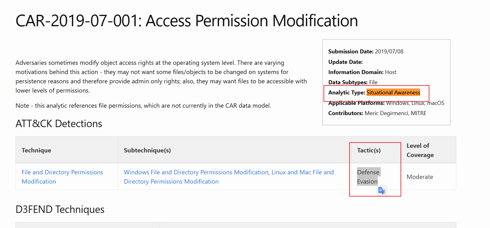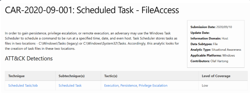 讓我們深入瞭解 CAR,並獲得一些實際操作經驗。我們將首先研究CAR-2020-09-001:計劃任務 - 文件訪問。訪問該頁面後,我們會看到分析描述以及相關的 ATT&CK 策略和技術參考。