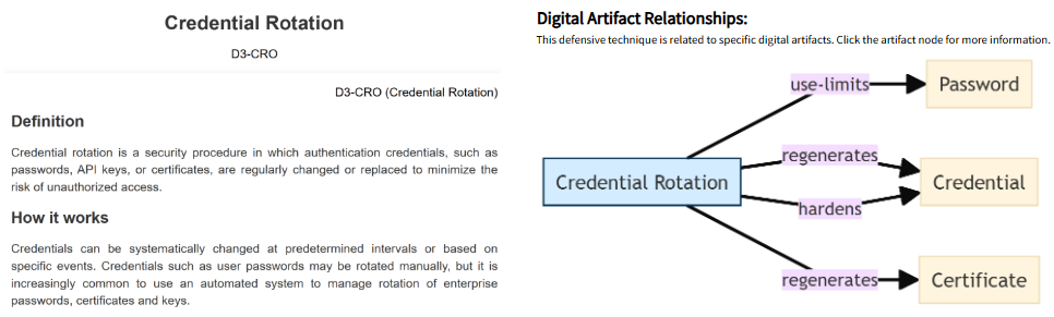 例如,憑證輪換 D3-CRO技術強調定期輪換密碼,以防止攻擊者重複使用竊取的憑證。D3FEND 解釋了這種防禦機制的工作原理、實施時需要考慮的因素,以及它與特定數字資產和 ATT&CK 技術的關係,幫助您從攻擊者的行動和防禦者的應對措施兩個角度來看待問題。
