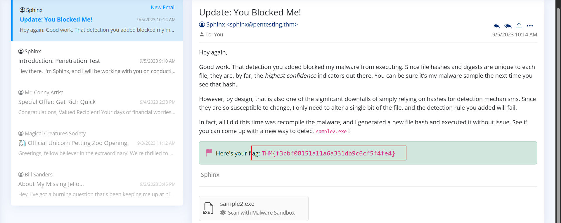 成功檢測到sample2.exe後,你收到的第二個標誌是什麼?