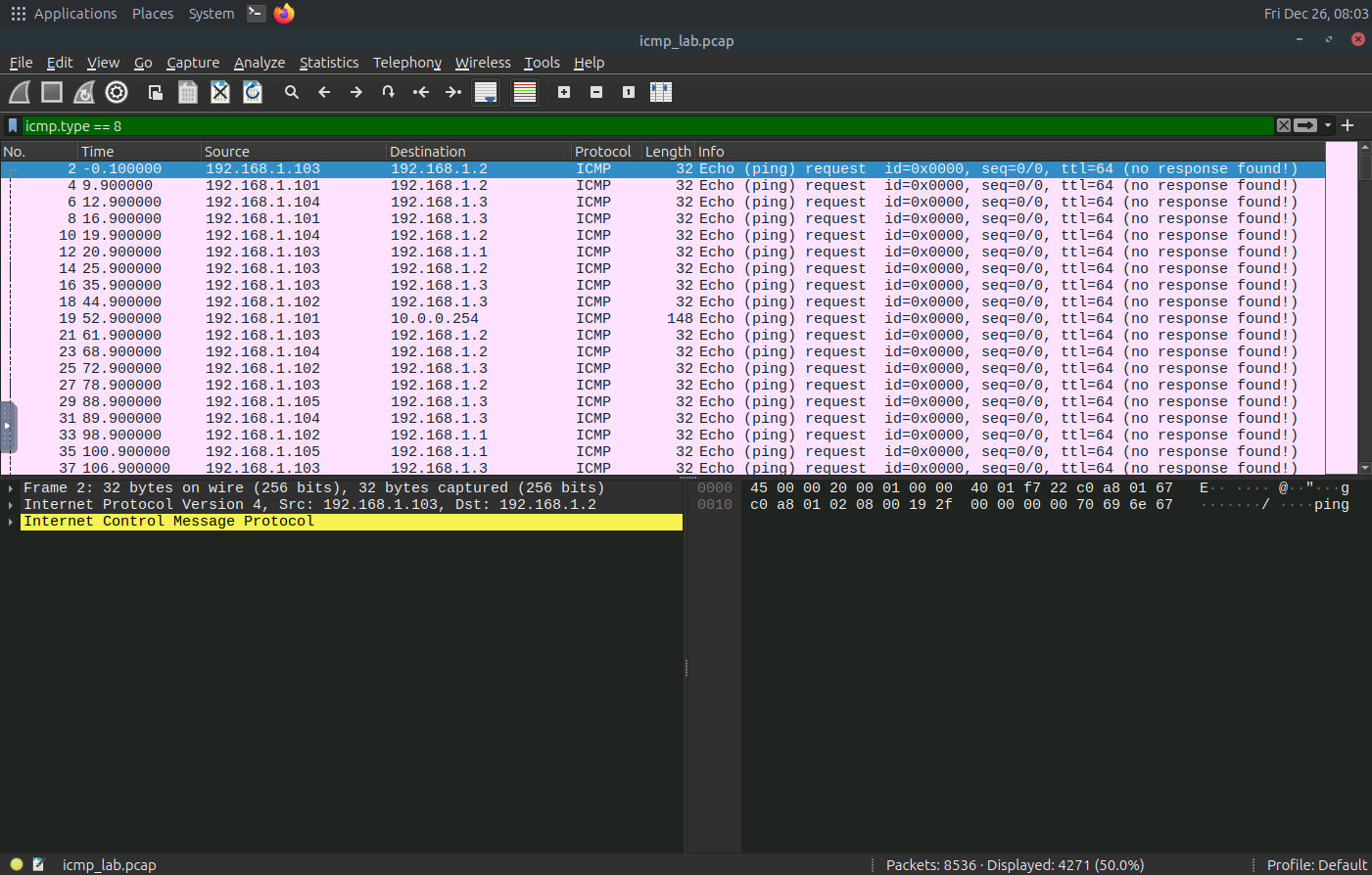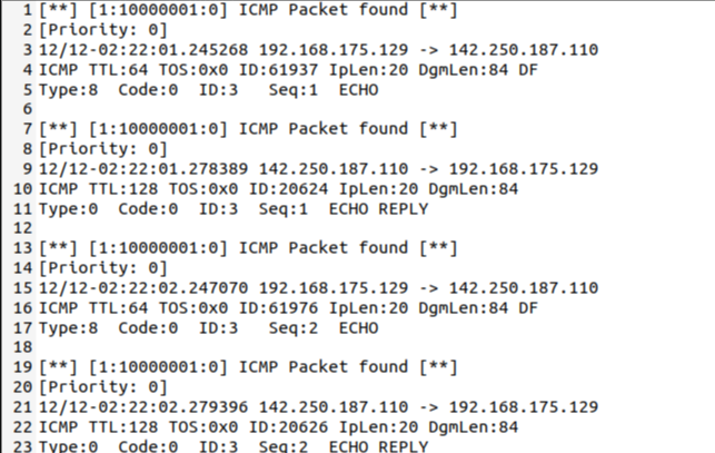 alert icmp any any <> any any (msg: "ICMP Packet Found"; sid: 100001; reference: cve , CVE -XXXX; rev:1 😉 |