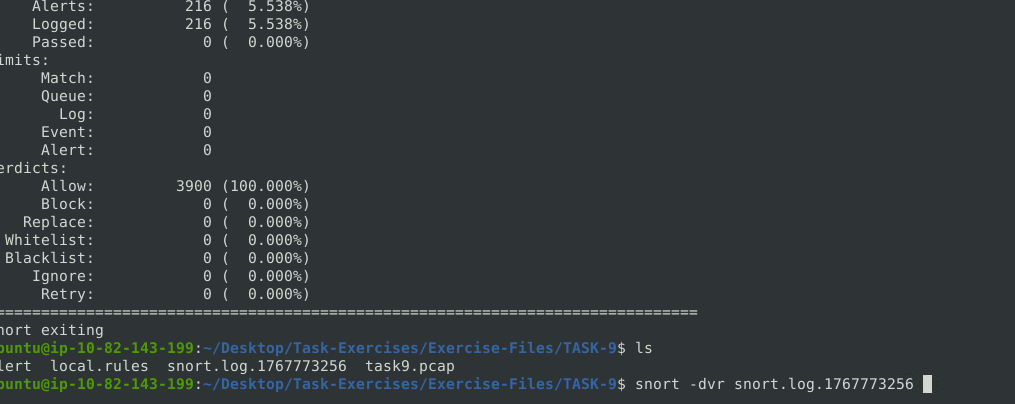 哇!我們已經掌握了 Snort 規則的基礎知識! 現在,請使用附件中的虛擬機,並導航到 Task-Exercises/Exercise-Files/TASK-9文件夾來回答問題! 請注意,您可以使用以下命令在當前目錄中創建日誌:-l