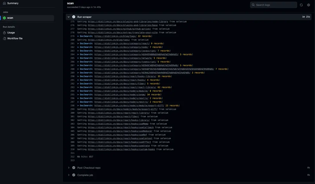 Docsearch 每週一次爬取網站 (可在網頁界面上配置具體時間), 並將所有內容彙總到一個 Algolia 索引中