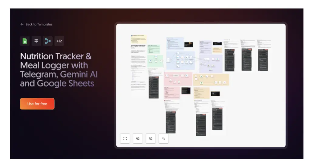 選擇模板: 點擊一個模板以查看其詳細信息。例如,名為“使用 Telegram、Gemini AI 和 Google Sheets 的營養追蹤與餐食記錄器”的模板。