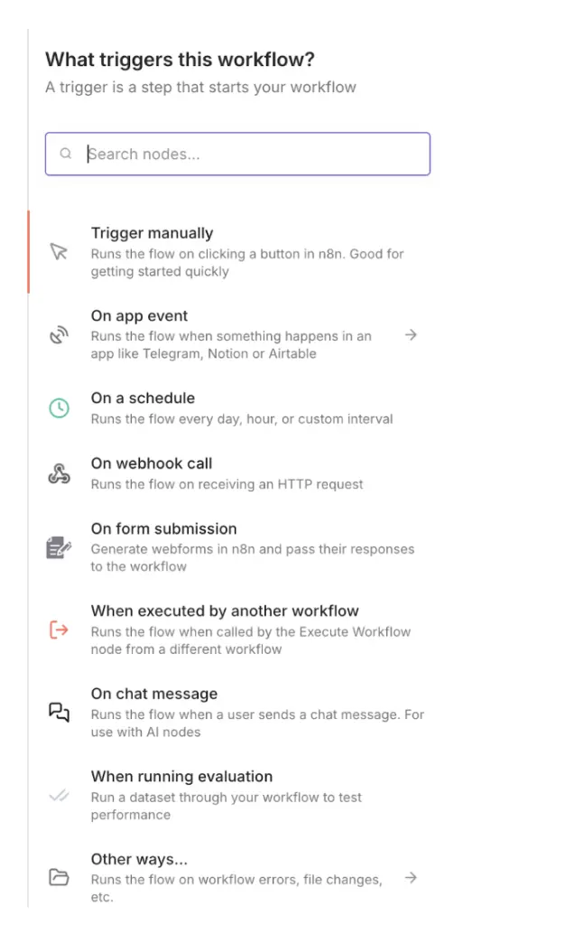 觸發節點用於啓動工作流。你可以選擇不同類型的觸發器,例如: