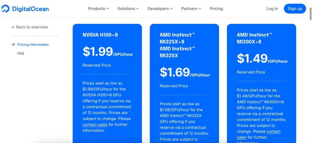 很多大型雲服務商提供 GPU 實例,但其配置往往較為複雜:你可能需要自己安裝驅動、調優網絡、配置 Kubernetes 節點、處理 IAM/Security 策略。而 DigitalOcean 強調“零複雜、GPU 幾分鐘上線”。