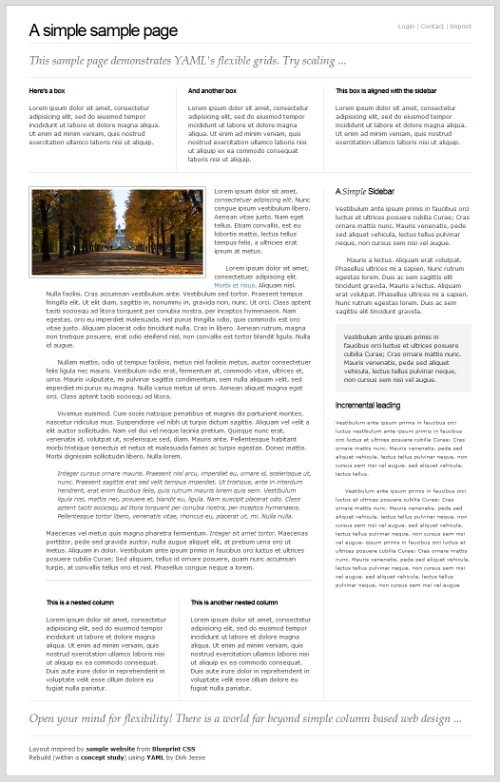 YAML takes a different route. The Framework supports the development of grid-based layouts as well as the development of the grid system - with the emphasis on flexible layouts. If a designer wants to create a grid-based layout he can use the basic skeleton with three columns, header and footer. Each element can be removed or adjusted to user’s needs. The actual design, the positioning of the columns, is done using CSS-definitions (and not HTML-structure as it is done in other CSS-frameworks). The benefit for designers: with YAML one has better options for defining his own system of classes, using any measurement units and getting clean code.