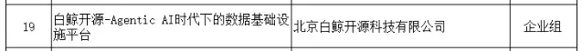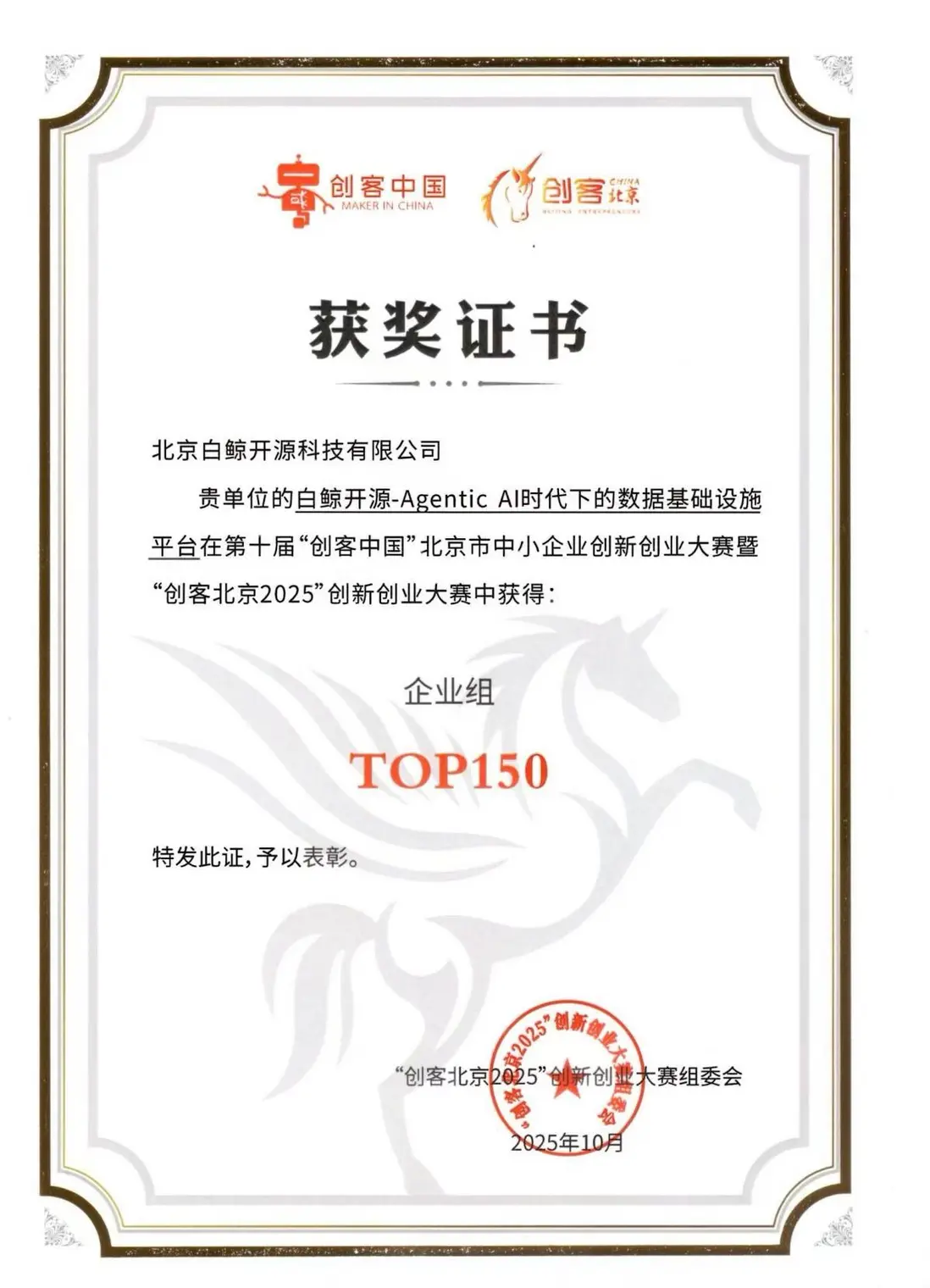 近日,第十屆“創客中國”北京市中小企業創新創業大賽暨“創客北京2025”創新創業大賽結果揭曉,北京白鯨開源科技有限公司憑藉“白鯨開源-Agentic AI 時代下的數據基礎設施平台”,榮登企業組 TOP150,並獲得大賽組委會頒發的獲獎證書。