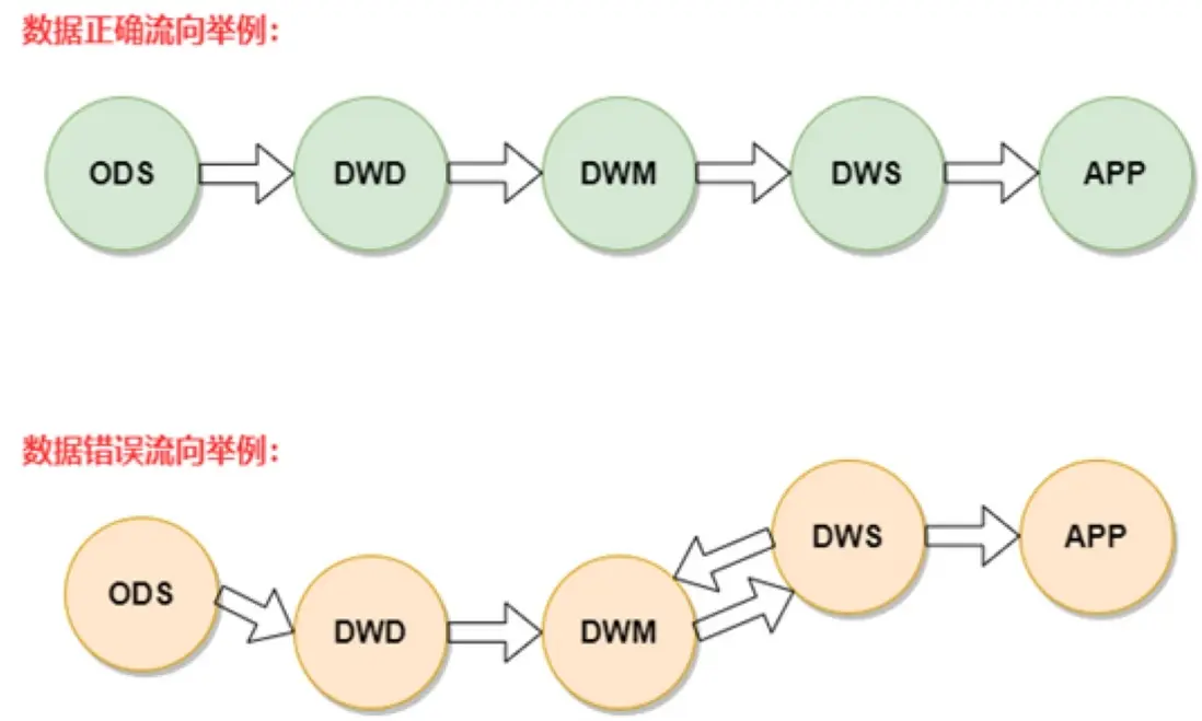 - 正常流向:ODS -> DWD -> DWM -> DWS -> APP,當出現 ODS -> DWD -> DWS -> APP 這種關係時,説明主題域未覆蓋全。應將 DWD 數據落到 DWM 中,對於使用頻度非常低的表允許 DWD -> DWS。