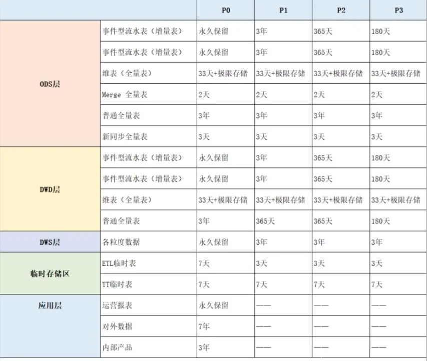 - P0 :非常重要的主題域數據和非常重要的應用數據,具有不可恢復性,如交易、日誌、集團 KPI 數據、 IPO 關聯表。