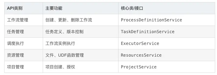 DolphinScheduler Java SDK提供了豐富的API接口,主要分為以下幾類: