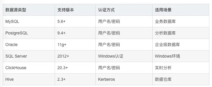 DolphinScheduler支持多種數據源類型,便於與企業現有數據平台集成: