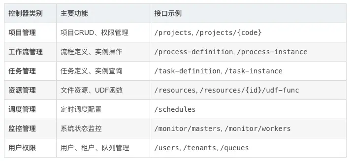 DolphinScheduler API包含20多個核心控制器,覆蓋了系統的所有功能模塊: