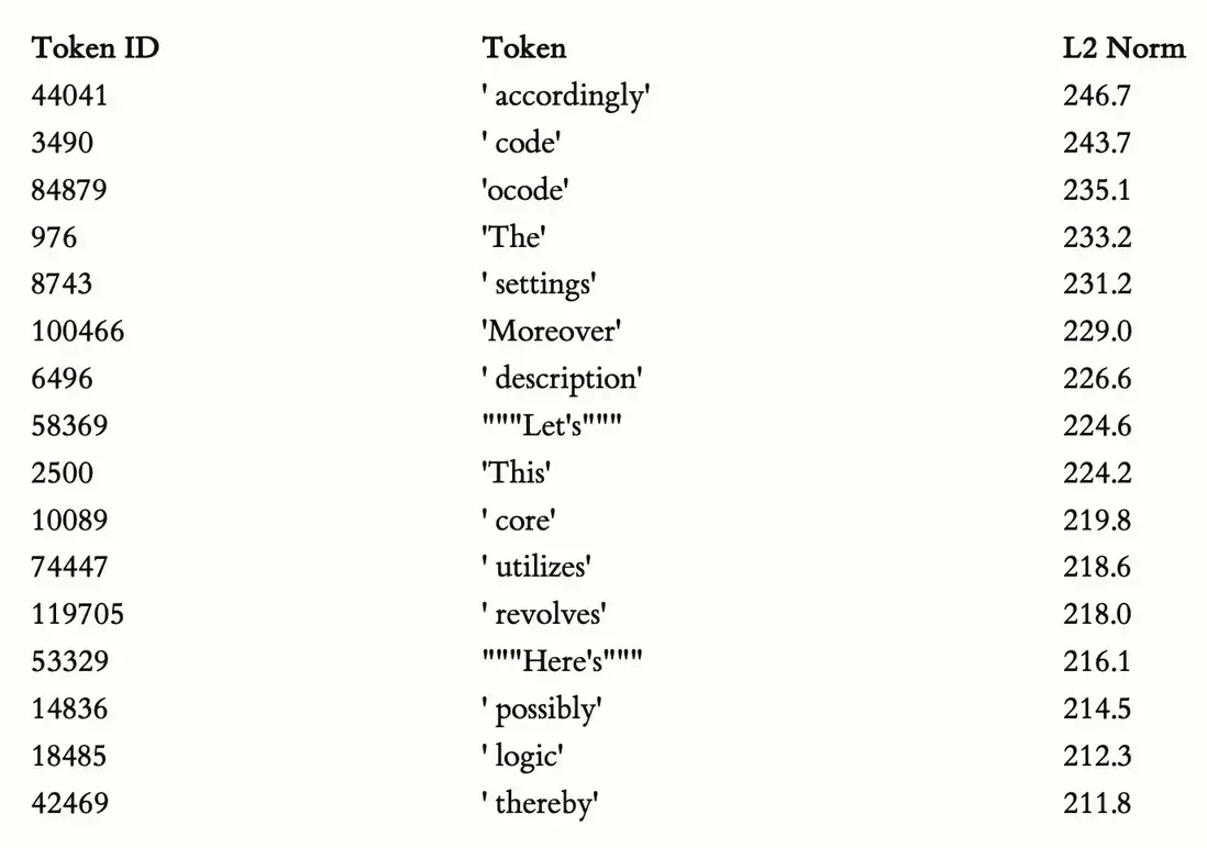 模型裏面每個 token 都有自己的向量權重。哪些詞越“重”(L2 Norm 越大),説明模型越容易被它們激活,也意味着訓練集中它們出現得越頻繁。