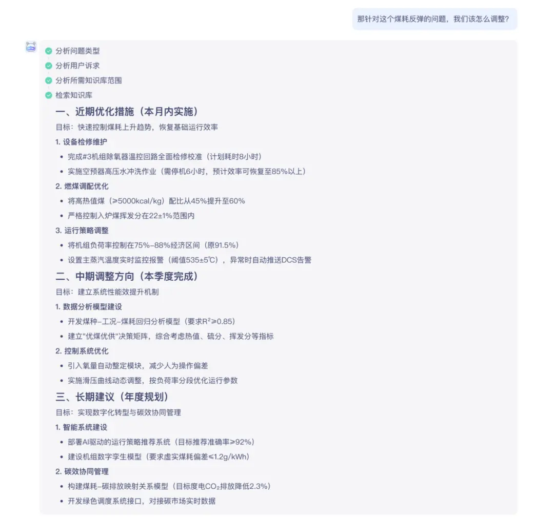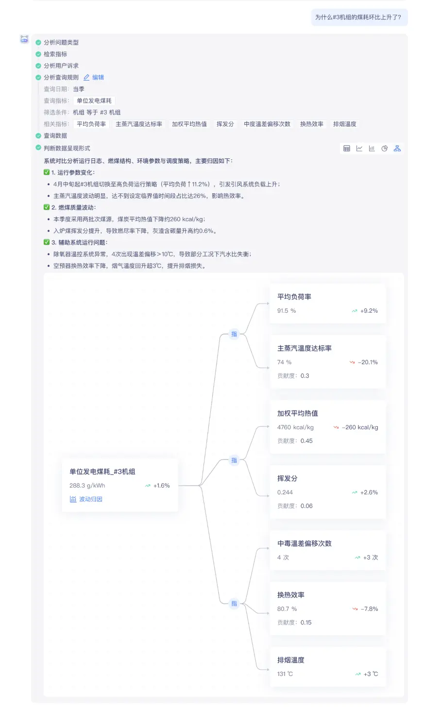 基於前期系統化的火電行業指標體系梳理和業務語義的統一,指標平台能夠精準解析用户意圖,自動調用相應指標定義、數據源與可視化模板進行應答。目前,該智能問數功能已逐步集成至集團數據門户與移動端平台,有效覆蓋大部分日常管理類數據查詢需求,顯著提升數據獲取的便捷性與分析效率,讓原本依賴專業報表團隊人工響應的問題轉變為員工自助式、即時性完成,從而有效推動了指標數據在各層級業務中的主動應用與價值釋放。