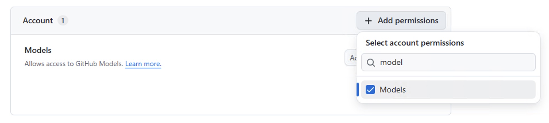 在 GitHub 的 Settings / Developer Settings 頁面,點擊 Personal access tokens / Fine-grained personal access tokens,進入 PAT 管理頁面,點擊 Generate new token 按鈕,進入創建 token 的界面,輸入 taken name,在最下面的 Permissions 部分添加 Models,點擊 Generate token 生成 token 並保存。