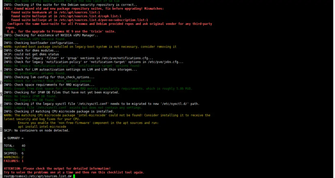版本未能更新成功,仍然是原來的版本,並且執行pve8to9 命令會報錯!