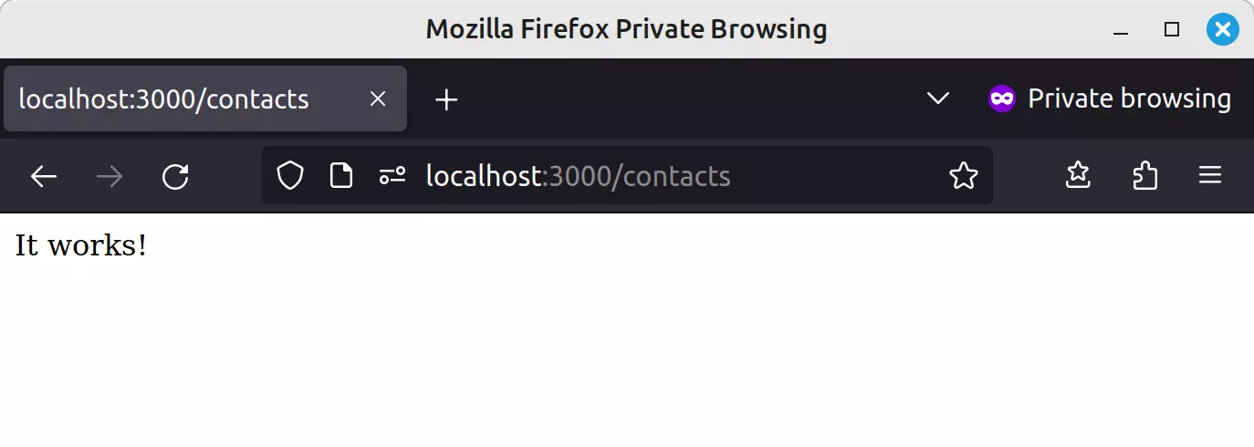 最後,使用 npm run dev 啓動所有內容,然後在瀏覽器中訪問 http://localhost:3000/contacts/。您應該會看到一條消息“It works!”。