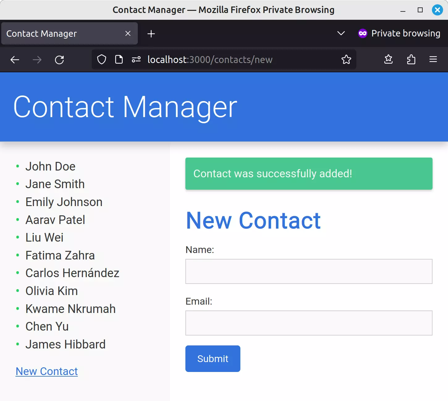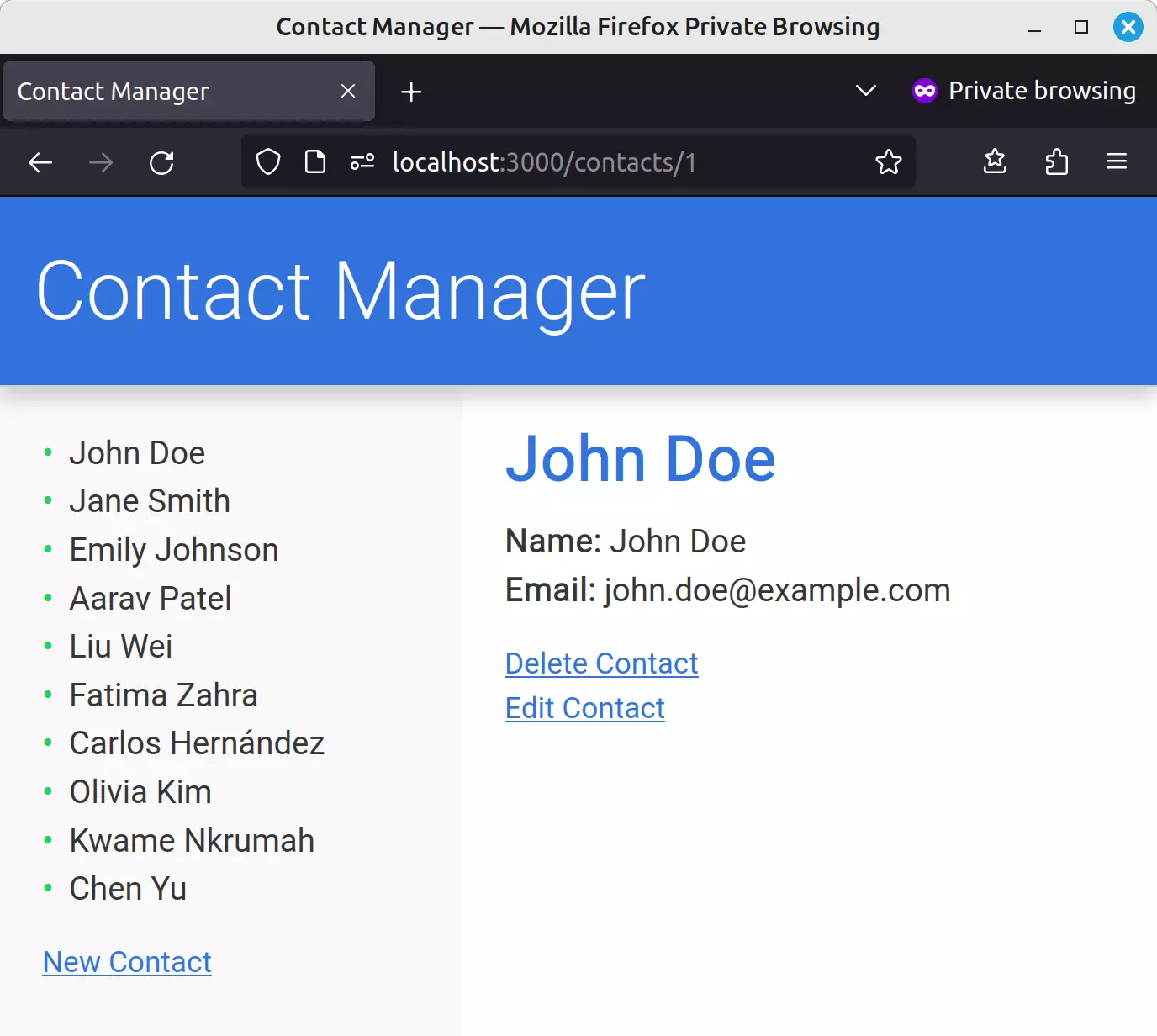 我們將開發一個簡單的聯繫人管理器,能夠執行所有 CRUD 操作:創建、讀取、更新和刪除聯繫人。通過利用 htmx,該應用程序將提供單頁應用程序 (SPA) 的感覺,從而增強交互性和用户體驗。