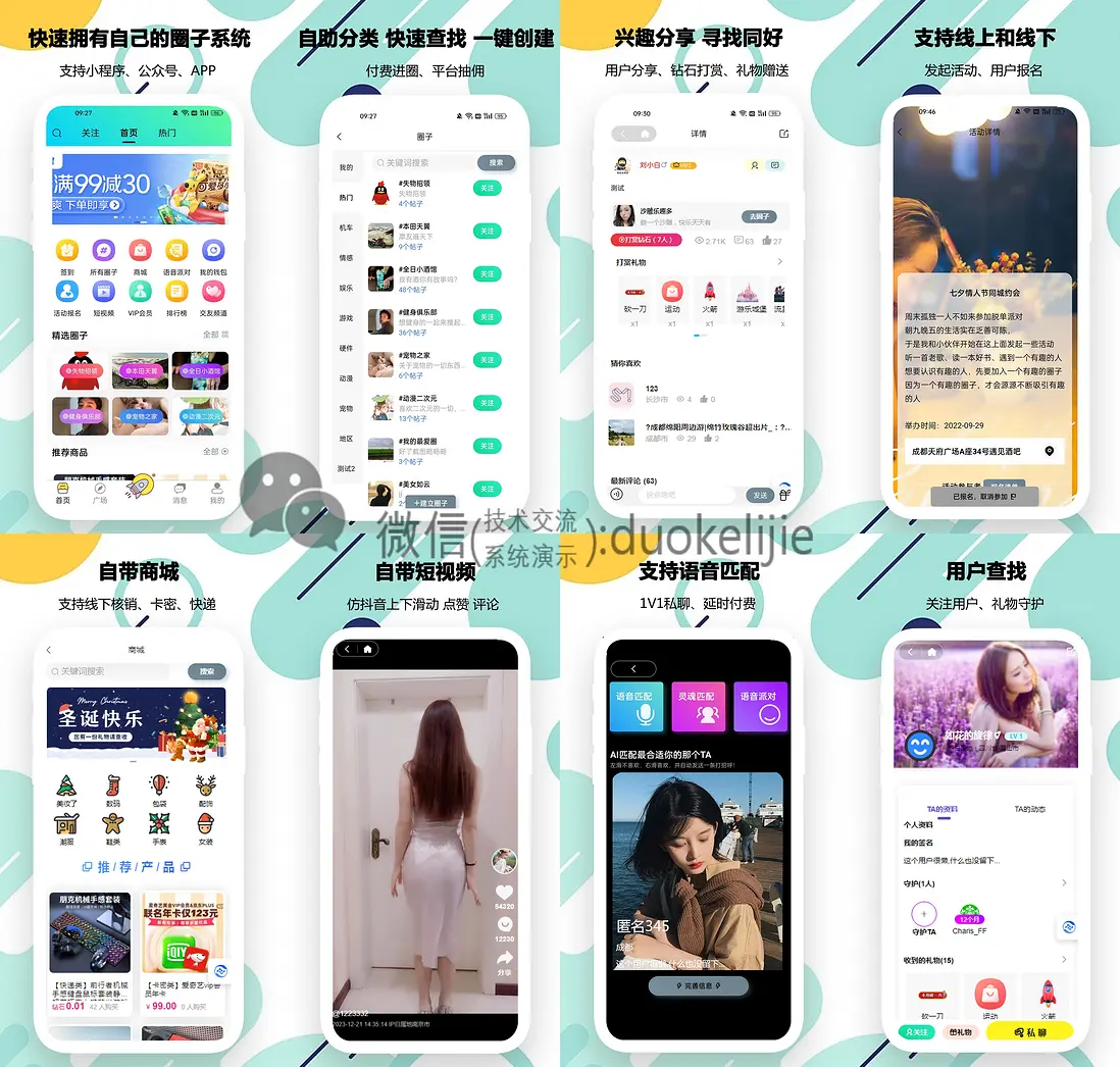 1.前端: Uniapp框架,支持微信小程序、H5、iOS/Android App一鍵生成,UI組件庫採用uView,提供社交場景專屬模板
