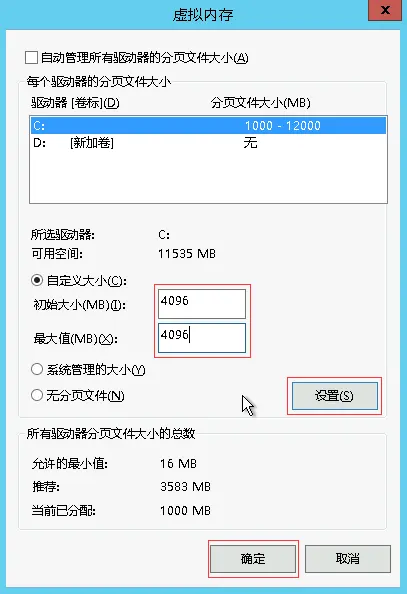默認選擇 C 盤創建虛擬內存,我這裏填寫 4G 的內存,4*1024 也就是 4096,點擊設置後確定。這樣虛擬內存就創建好啦,需要重啓後才生效。