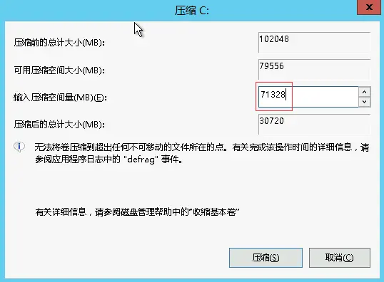 設置要壓縮出來的 D 盤空間,最後一項壓縮後的大小是 C 盤的大小,建議根據總磁盤大小留 20-30G 的空間,如果不想計算,填寫 30000 大概小 30G 的 D 盤容量應該就差不多了。然後一直下一步直到完成。