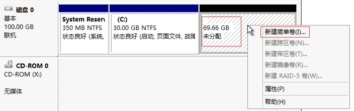 完成後就會顯示壓縮的磁盤,點擊該磁盤,鼠標右鍵,選擇新建簡單卷。