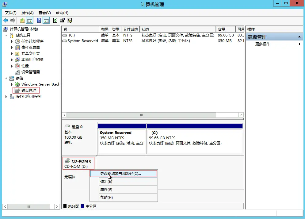 選擇左側磁盤管理,點擊 CD-ROM 鼠標右鍵,選擇更改驅動號和路徑。