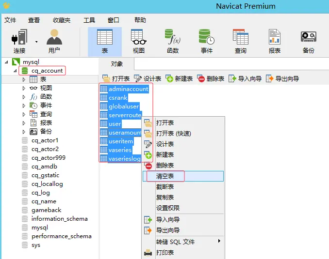 以第一個數據庫為例,連接 MySQL 數據庫後,打開數據庫cq_account,選中其下的所有表,鼠標右鍵點擊清空表,千萬別點刪除表哈,已打開的表要關掉,否則無法清空。