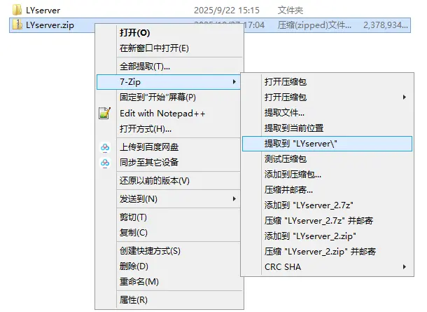 傳到 D 盤後,點擊文件鼠標右鍵選擇提取到"LYserver\"。