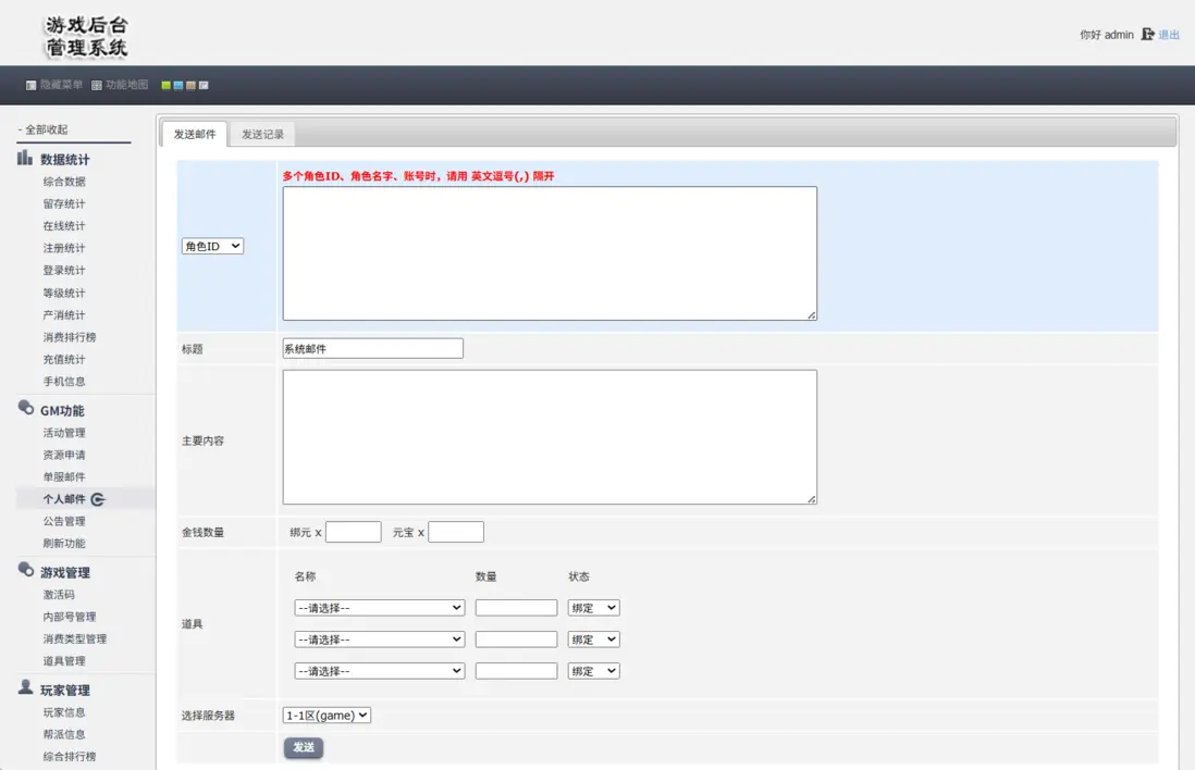 玩家 GM 後台鏈接:http://IP/gm/,輸入角色名前記得加上s1.,密碼為授權時設置的密碼,登錄後就可以發送元寶和物品啦。