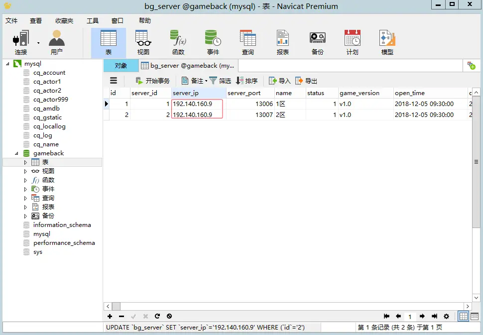 連接上數據庫後修改數據庫gameback表bg_server中的server_ip,改為你自己的 IP。經測試這個數據庫中的服務器 IP 和區名實際是不生效的,真正生效的是文件D:\LYserver\phpstudy_pro\WWW\args.php中的服務器 IP 和區名配置,不過還是建議你將數據庫中的 IP 改掉,以免出現異常 BUG。