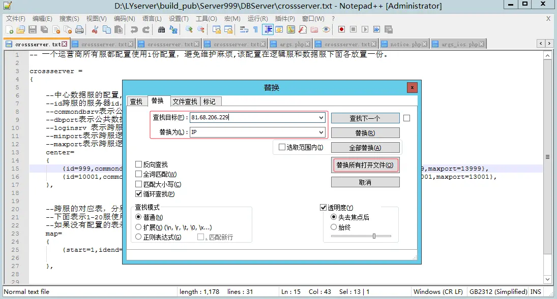 點擊D:\LYserver\目錄下的0.一鍵打開所有修改IP文件會自動打開所有要修改 IP 的文件,將 IP(81.68.206.229)全部改為你自己的服務器 IP。