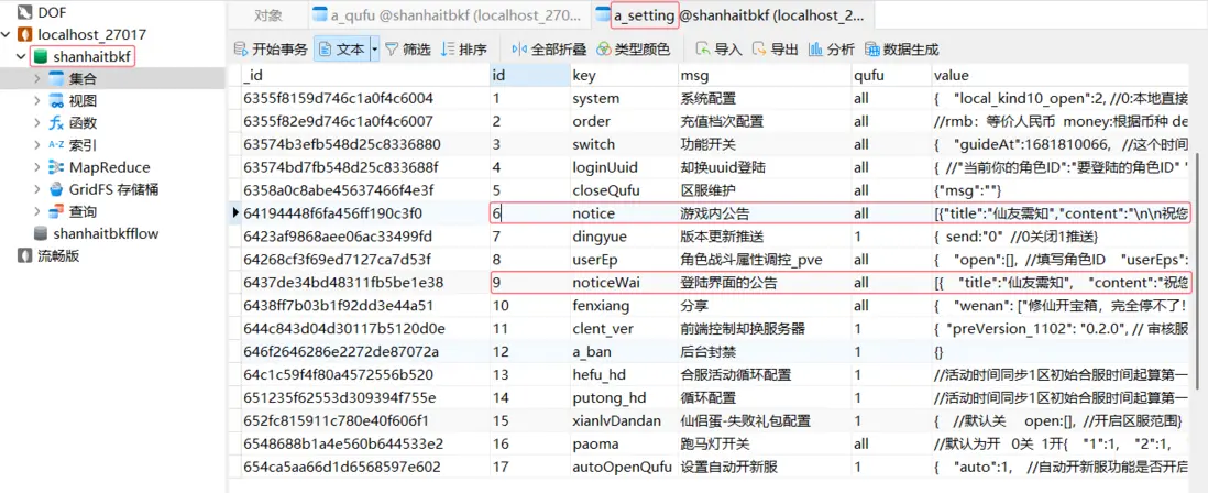 公告修改也很簡單,同樣修改 MongoDB,打開數據庫shanhaitbkf集合a_setting,修改id為6和9的value值,按照原有格式修改即可,分別代表遊戲內公告和登錄界面公告,重啓遊戲後生效。