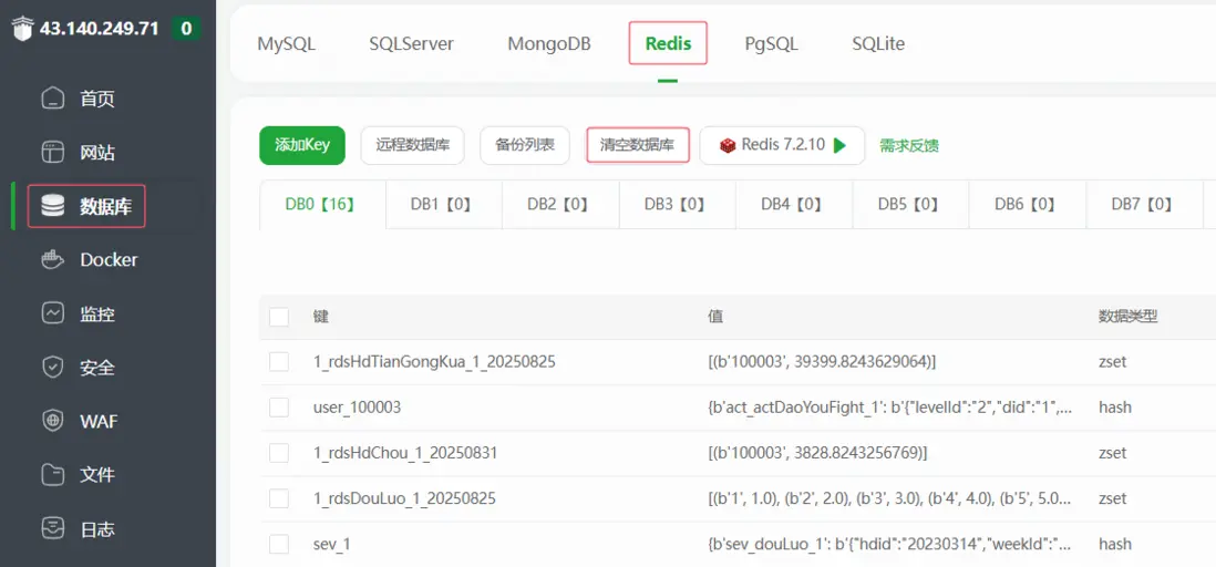 不過我更建議按照我的方式清檔,分別對三種數據庫清檔。其中 MySQL 和 MongoDB 按照教程上面的重新導入即可,Redis 在寶塔中可以直接清空數據庫,然後重啓遊戲即可。