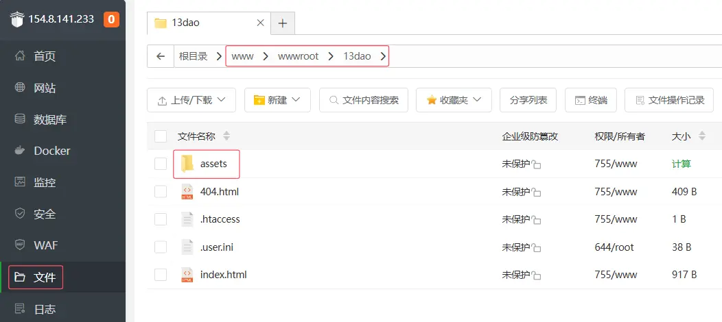 因為遊戲支持 H5 鏈接,所以會加載大量的遊戲靜態資源佔用寬帶,觀察瀏覽器網絡請求,發現大量的靜態資源都在/www/wwwroot/web-mobile/assets目錄下,所以我們將assets目錄上傳到資源服務器目錄/www/wwwroot/13dao下。