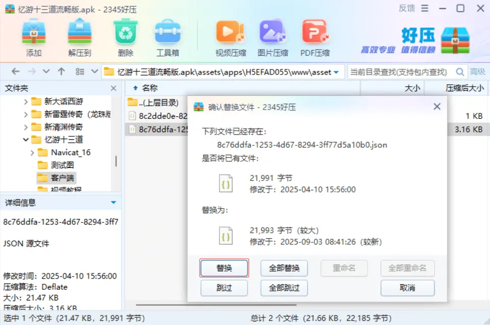 資源客户端目錄下找到憶遊十三道.apk安卓客户端,用好壓軟件打開,將文件8c76ddfa-1253-4d67-8294-3ff77d5a10b0.json拖出來。使用資源中的 Notepad++ 打開,將 IP(43.140.249.71)替換成你自己的服務器 IP。