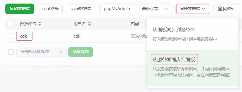 在同步數據中點擊從服務器同步到面板,可以獲取到一個數據庫,説明導入成功。