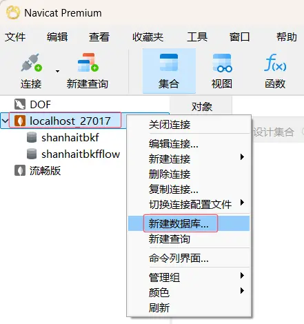 MongoDB 連接成功後,鼠標右鍵新建數據庫shanhaitbkf和shanhaitbkfflow。
