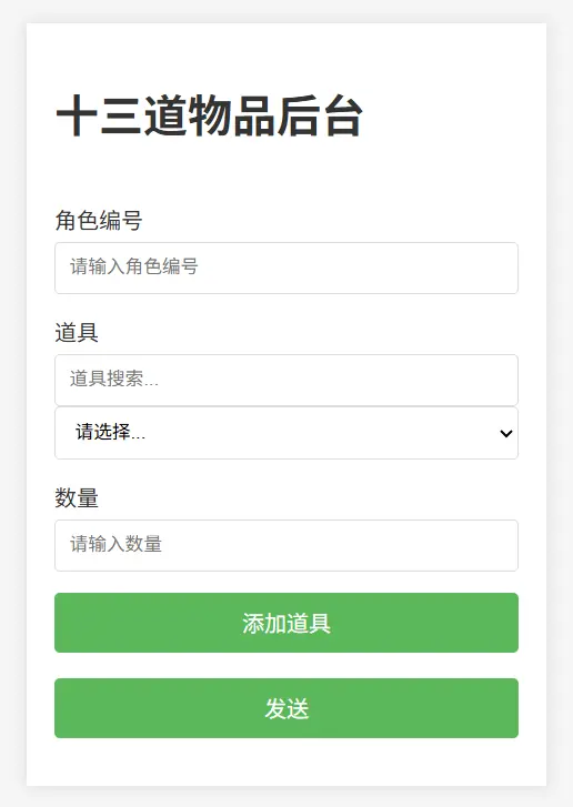 授權後就可以打開玩家 GM 後台:http://IP:81/gm/ht.html,填寫角色編號,選擇物品填寫數量,點擊添加道具,然後就可以發送啦~