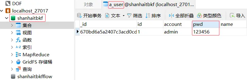 主要修改的是運營後台的密碼,需要修改 MongoDB,打開數據庫shanhaitbkf集合a_user,修改pwd值即可。